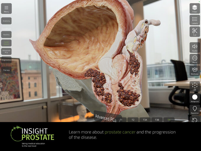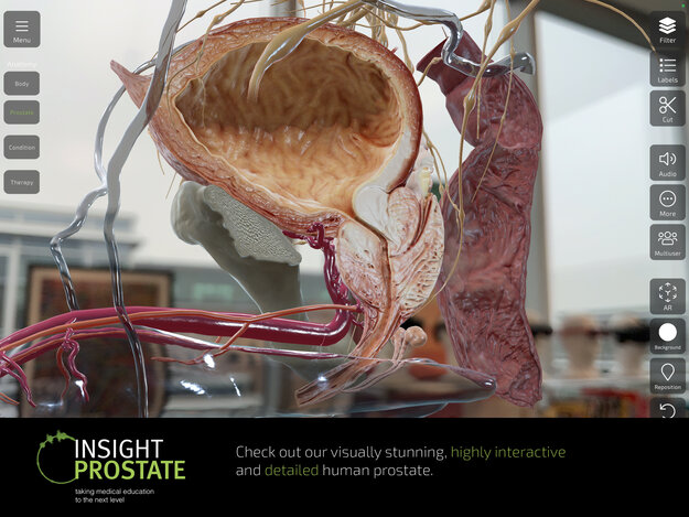 INSIGHT PROSTATE improves understanding of prostate cancer for patients, families, and professionals. It explains anatomy, disease stages, diagnostics, and treatments in German and English to enhance doctor-patient interaction. Based on a survey of healthcare needs, it offers intuitive, visual education. Using Augmented Reality, users can explore a 3D prostate guided by virtual assistant ANI, with accurate depictions of healthy and diseased states. Designed for patients, relatives, and medical students, it bridges knowledge gaps and supports better decision-making through interactive and easy-to-understand insights.