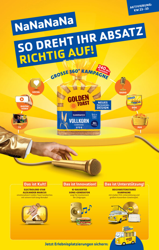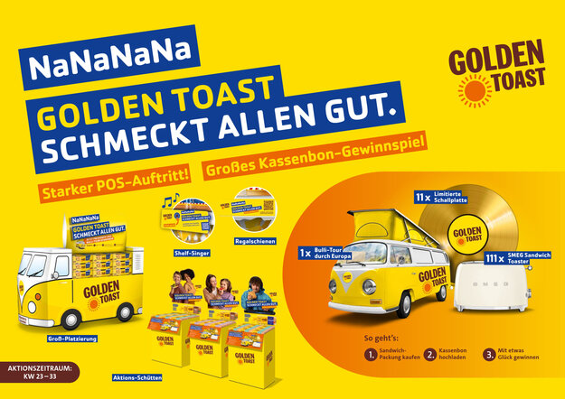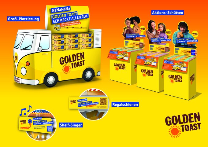 GOLDEN TOAST has provided the catchy tune of 2024! For the flashiest collaboration since sandwiches, the Love Brand has brought electrolore star Alexander Marcus on board to prove to the world how unbeatably excellent taste and melodic sounds can be combined. There was also an ultimate AI song generator, which was used to create numerous personal summer hits about sandwiches. In addition, all packaging designs were changed and an award-winning experience placement at the POS in the form of a huge van was set up. The recipe for success was ready.
