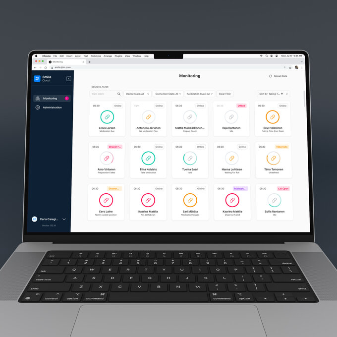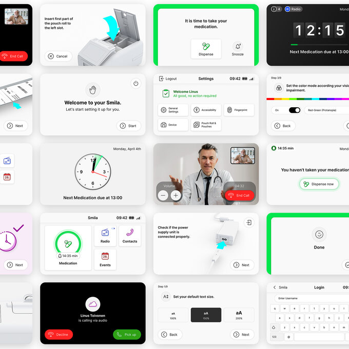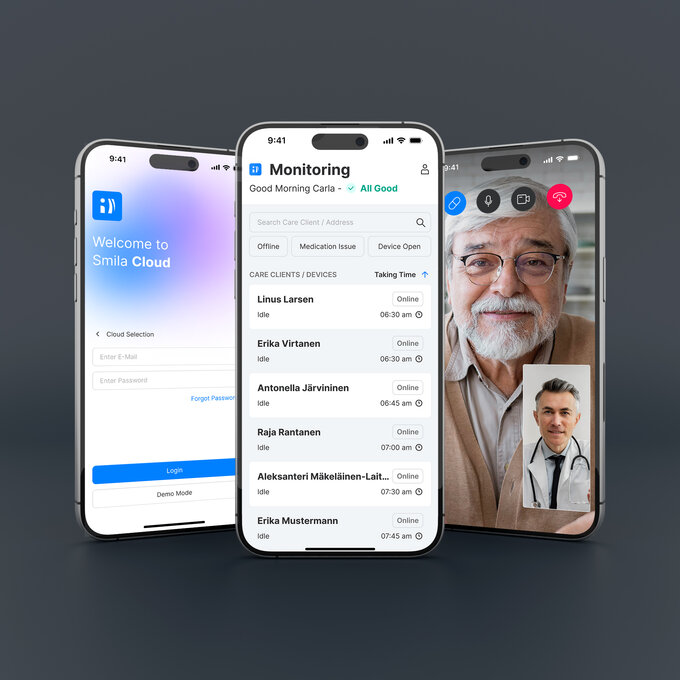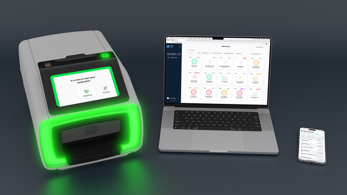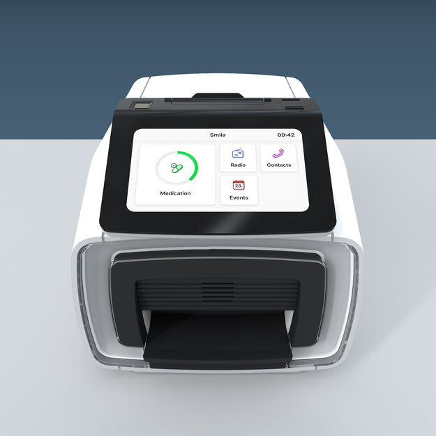 Smila Gen 2 is a digital medication dispenser that helps older people to take their medication correctly and safely. This increases patient safety and reduces the workload for nursing staff. The cloud-based system consists of an on-site medication dispenser, a web front-end and a mobile app that connects patients, caregivers and medical facilities. The system enables monitoring, remote medication and video calls. The user-friendly design with a focus on accessibility ensures unrestricted use and thus improves the quality of life of all patients.