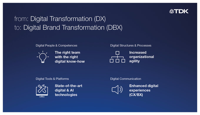 Since its foundation in 1935, TDK has constantly evolved: From a specialist for magnetic ferrites to the No. 1 brand for compact cassettes to a leading manufacturer of electronic components. Today, TDK components can be found in many applications, in xEVs as well as in robots, wind turbines, household appliances, medical technology, smart wearables and edge AI devices. TDK pursues a clear digitalization strategy, which also guides TDK marketing and ensures demonstrable brand success. This makes TDK a strong benchmark for digital brand transformation in the B2B sector.