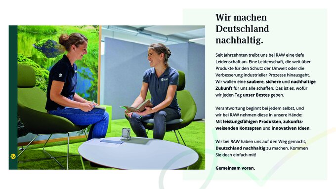 RAW shows that great visions can grow from small beginnings. A small trader and raw materials' processor has become an international partner for expert advice and innovative product solutions in the areas of environmental protection, sustainable industrial processes and occupational safety. The brand strategy with the guiding principle “progress together” establishes RAW as first choice for the target groups of dealers, manufacturers and users from industry, traffic and transportation, construction, public sectors and municipal companies. The success: up to 57 % sales growth in relevant business areas – inconspicuous becomes pioneering.