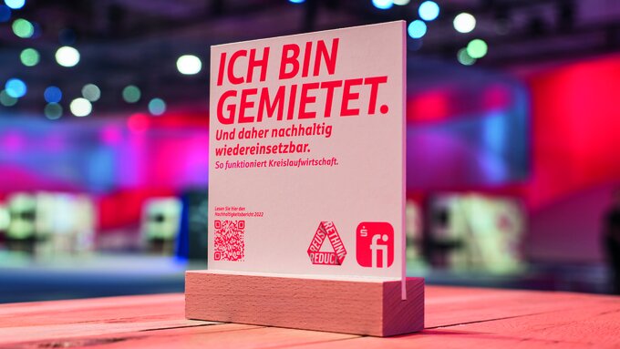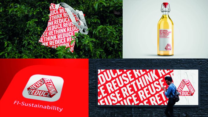 REthink, REduce, REuse - the sustainability branding of Finanz Informatik (FI): rethinking processes and goals and changing them with a view to the future, creating awareness for the resource-saving use of materials and energy, achieving relief for people and the environment in order to make a positive contribution today for the world of tomorrow. For trade fair and event communication, it means using reusable components and regional catering with transparent production and supply chains. The sustainability branding serves as an impulse for dialogue and acceptance of changed framework conditions. The reactions were consistently positive.
