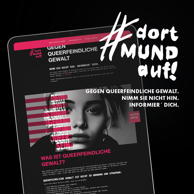 #dortMUNDauf - Strengthening queer visibility, countering violence. Anti-queer violence often remains invisible - only 13 % of those affected report assaults. With #dortMUNDauf, Slado e.V. and helloyou.studio are sending a strong signal and calling on those affected and those who witness violence to take action. Our campaign combines posters, social media, stickers, an informative website and emergency folding cards to make education and support tangible. The aim is to empower queer people, raise awareness and initiate social change. #dortMUNDauf stands for a city that opens up - for diversity and solidarity.