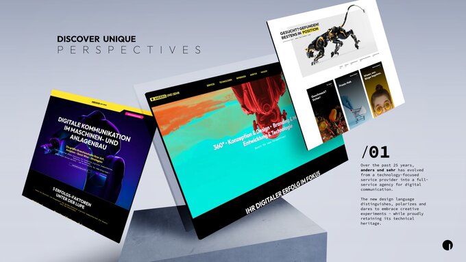 New is what has never been seen like this before. Over the past 25 years, anders und sehr has evolved from a pure IT service provider into an agency for digital communication. The new corporate identity dares to turn things upside down and challenge familiar perspectives. The logo, color scheme, imagery, and headlines immediately convey that everything is DIFFERENT. And indeed, VERY. SPOTTING IDEAS – TURNING IDEAS INTO REALITY. Communication for an agency that wins over potential clients and employees with unconventional ideas and outstanding technical solutions. And stays in mind at first glance.