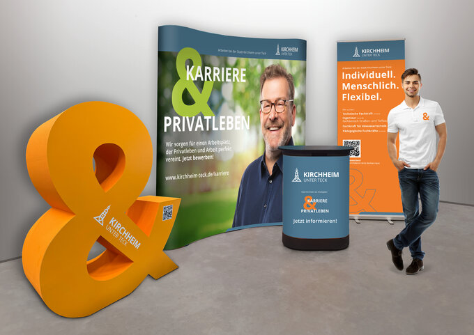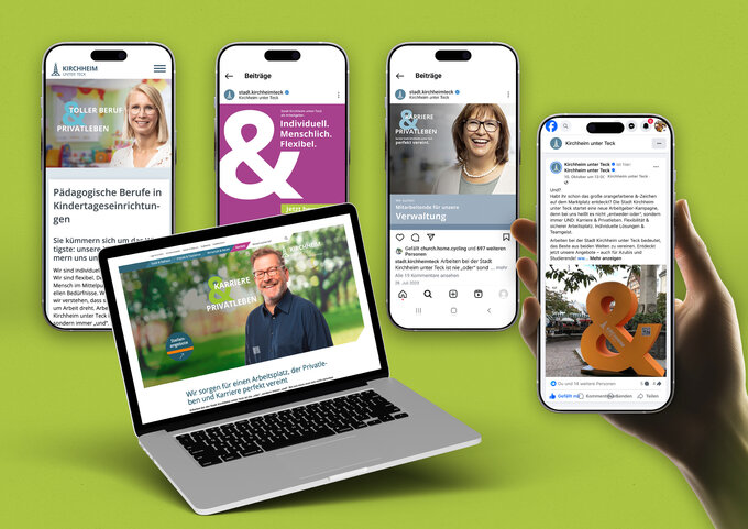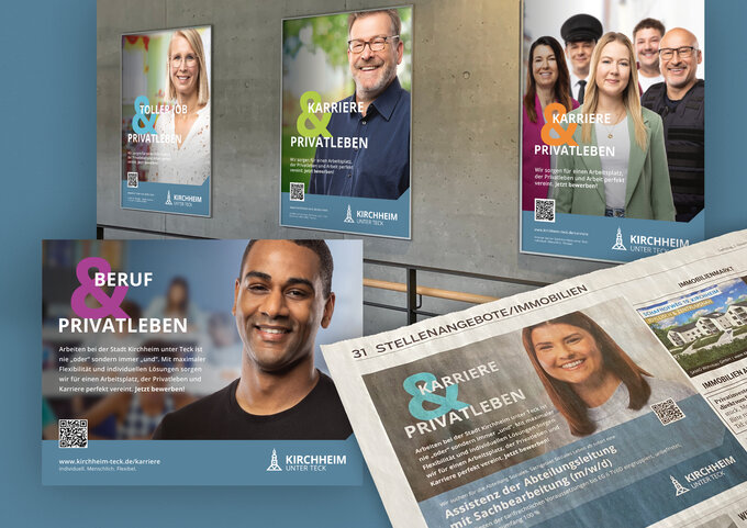 The challenges of recruiting staff are becoming increasingly complex – even in administration. With this in mind, we have developed the new employer brand with the involvement of employees. The central argument in favour of the city as an employer is that apparent contradictions such as ‘private life’ and ‘career’ as well as ‘team spirit’ and ‘independence’ are resolved. Working for the city is never ‘or’ but always ‘and’. Employees do not have to choose. Visually conveyed in the form of the & sign as well as a broad colour palette and real employees who underline the variety of possibilities.