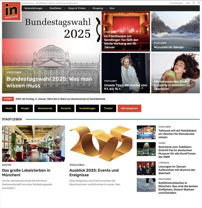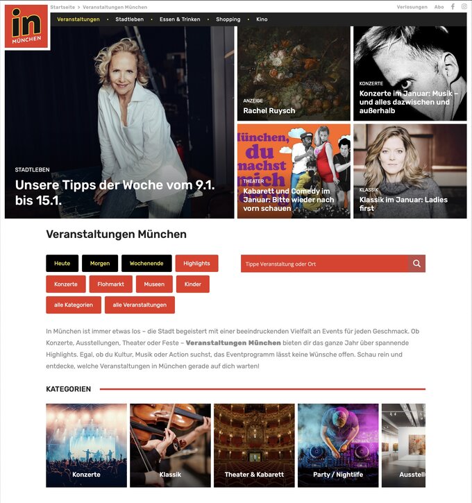 IN München is the leading city and event magazine for Munich and the surrounding area. Since 1983, it has provided exciting insights into the city’s cultural life, offering expert reviews, tips on culture, gastronomy, shopping, excursions, and exclusive interviews. With the highest circulation, the most extensive event calendar in the region, a comprehensive gastronomy and shopping guide, and daily reports on city life, IN München is published monthly and distributed free of charge at over 800 locations. The offering is rounded off by a highly frequented website and an active presence on social media.