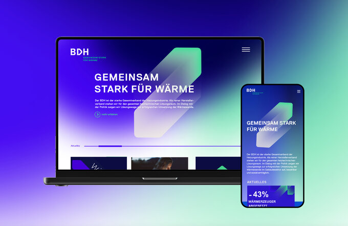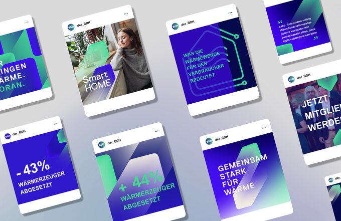 The transformation of the heating market is essential for achieving the climate targets. As the leading institution in the heating industry, the BDH is now visibly supporting this transformation. A new brand identity symbolizes dynamism, change and openness and positions the association as an innovative opinion leader. Systematized design elements ensure a uniform appearance. Under the motto “Turning to Future”, the brand identity for the 40th anniversary was implemented on the website, in social media, publications, trade fairs and events. The claim “Gemeinsam stark für Wärme” strengthens the industry on the path to climate neutrality.