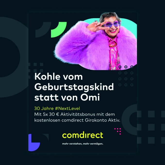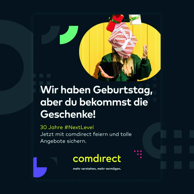 comdirect – eine Marke der Commerzbank AG feiert 30-jähriges Jubiläum. 1994 als Onlinebroker gegründet, ist die comdirect heute Direktbank und Onlinebroker mit einem der breitesten und qualitativ hochwertigsten Leistungsangebote im Markt. Anlässlich des Jubiläums wurden unter dem Dach „30 Jahre #NextLevel“ umfangreiche Marketingaktionen für Neu- und BestandskundInnen entwickelt und im Markt ausgespielt. Zusätzlich zu klassischen Disziplinen im Campaigning über den gesamten Marketingfunnel hinweg war ein Highlight das Online-Gewinnspiel #NextLevel nach dem Vorbild eines klassischen „Jump & Run“-Spiels im 90er-Style.