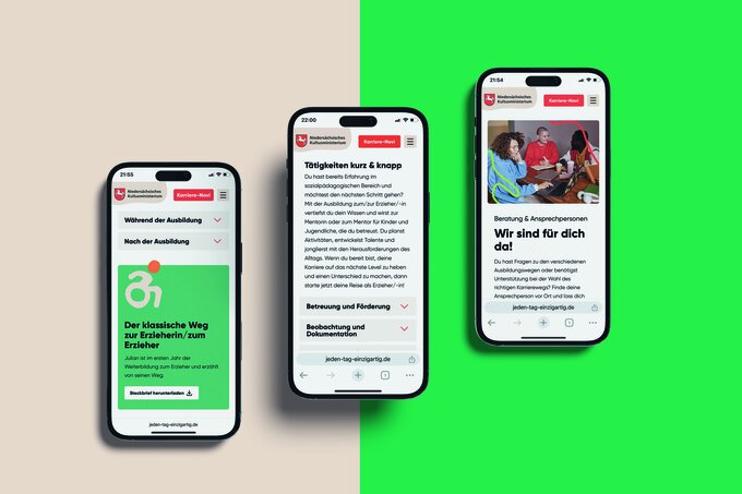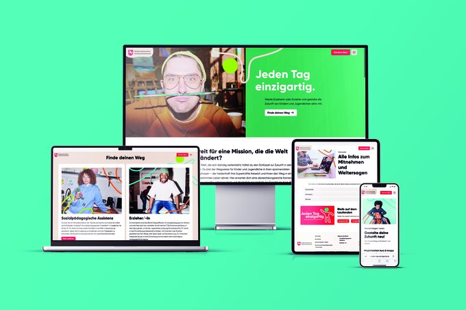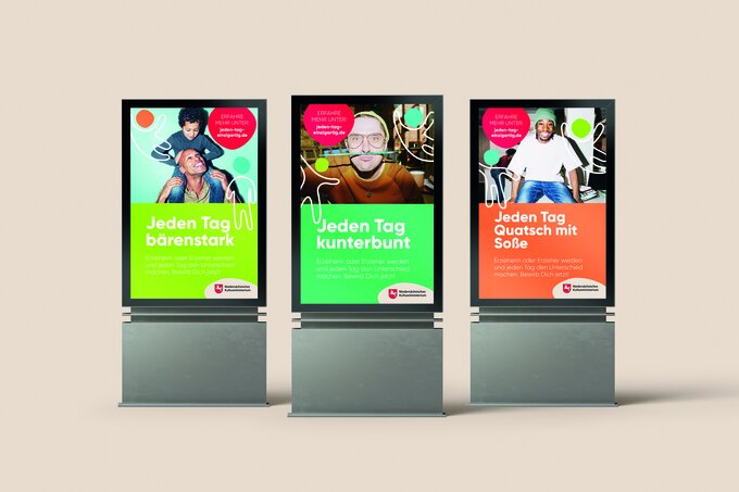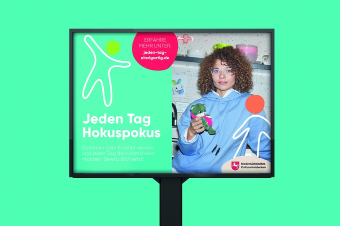 Im Auftrag des Niedersächsischen Kultusministeriums entwickelte B&B. die Kampagne „Jeden Tag einzigartig!“, die zum Ziel hat, junge Menschen für Jobs im sozialen Bereich zu begeistern. In der farbenfrohen und lebendig gestalteten Kampagne liegt der Fokus auf einer emotionalen Ansprache mit authentischen Geschichten und eindrucksvollen Bildmotiven aus dem Kita-Alltag. Als zentrale Informationsplattform bietet eine Kampagnenwebsite Interessierten umfassende Inhalte zu den Einstiegsmöglichkeiten und Perspektiven in den sozialen Berufen. Verschiedene Erzieher*innen geben in kurzen Imagevideos einen authentischen Einblick in ihren Arbeitsalltag.