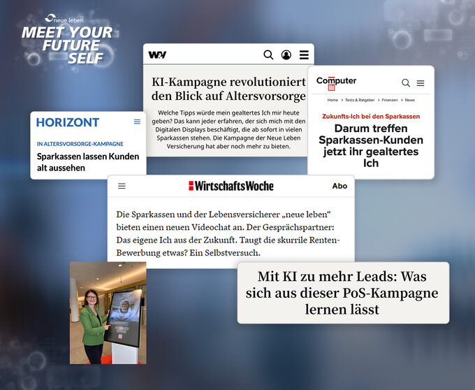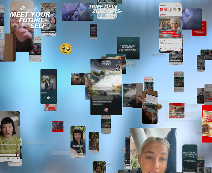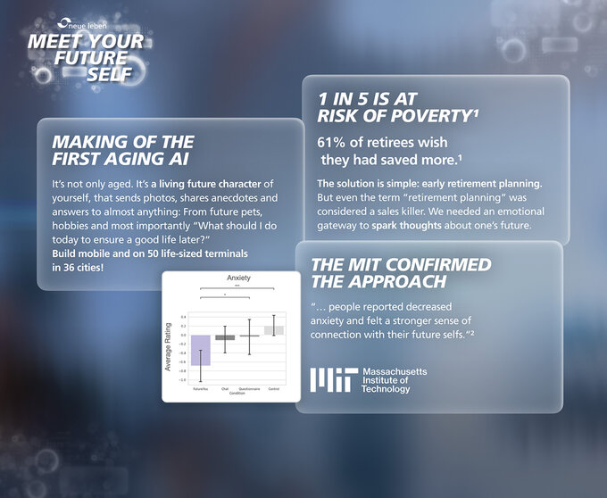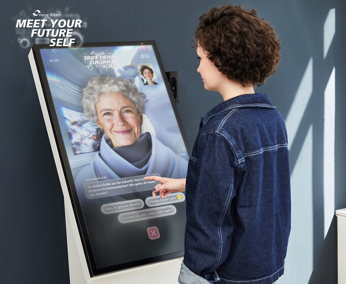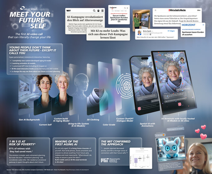 Diese Kampagne nutzt die wichtigste Person für die Altersvorsorge: wir selbst – in der Zukunft! Herzstück des Zukunfts-Anrufs ist das eigens entwickelte und trainierte KI-Aging Modell. Es erzeugt eine positive und anstrebsame Vision eines gesund gealterten Ich's. Nutzer:innen können den Video-Call auf jedem Device starten und sowohl per Freitext als auch über geführte Auswahloptionen mit ihrem Zukunfts-Ich interagieren. Durch gezielte Themenvorgaben werden relevante, hilfreiche Dialoge ausgespielt. Die schnelle und intuitive Bedienung ermöglicht die gezielte Überleitung zum Thema Altersvorsorge.