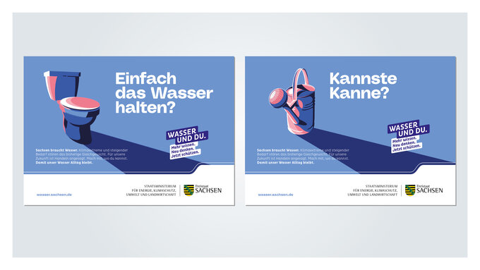Wasser ist ein kostbares, weil knappes Gut. In einigen Teilen Sachsens ist die Situation dramatisch. Das sächsische Umweltministerium wollte gemeinsam mit seinen Behörden die Bevölkerung für das Thema sensibilisieren. Eine prägnante Kampagne regt zum Nachdenken an. Markante Motive machen aus Reduktion eine visuell starke Tugend und ziehen an. Die Aufforderung wird zum Ausgangspunkt für Thema, Problem, Erkenntnis, Einsicht und Lösung. Ein flexibles Erscheinungsbild ermöglicht einen mehrstufigen inhaltlichen Ansatz und eine zeitnahe Reaktion auf Ereignisse.