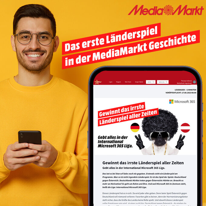 Wir entwickelten für MediaMarkt Europa „Stars of Sales“. Es ist wie ein Online-Game - aber eben für Verkäufer*innen auf deren Handys. Wie in einem Game spielen hier Märkte mit ihren Mitarbeiter*innen in Ligen zu Produkten der B2B-Partner gegeneinander und sammeln Coins. Sie machen das mit Verkaufsabschlüssen und Engagement: dem Konsum von Videos und Beiträgen oder im Quiz. Für Microsoft starteten wir das erste Länderspiel in der Geschichte von MediaMarkt: Deutschland gegen Österreich. Wir spielten mit den sprachlichen Widersprüchen der beiden Länder und bauten in Beiträgen die stärksten Verkaufsargumente für Microsoft 365 ein.
