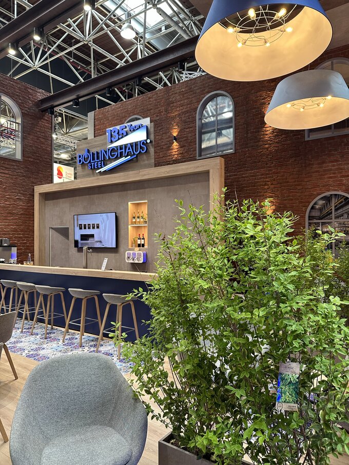 Auf der Wire & Tube 2024 präsentierten wir uns unter dem Motto „Welcome home with Böllinghaus“ anlässlich unseres 135-jährigen Jubiläums. Der Messestand verband Tradition und Innovation: Das eigens gestaltete Jubiläumslogo erstrahlte über dem einladenden Bar-Bereich, während die nachgebildete Fassade unseres Firmensitzes in Hilden eine vertraute Atmosphäre schuf. Portugiesische Akzente, wie die Böllinghaus-Azulejos und der Blick auf unser Werk in Portugal, unterstrichen unsere kulturelle und unternehmerische Vielfalt sowie Verbundenheit zum Produktionsstandort.