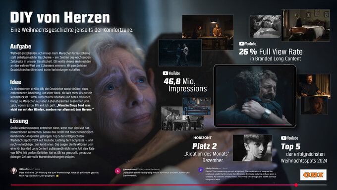 OBI, einer der führenden Anbieter im Bereich Do-it-yourself, hat mit seiner Weihnachtskampagne eine neue emotionale Ebene in der Markenkommunikation erschlossen. Die berührende Geschichte zweier Brüder und einer selbstgebauten Bank macht den Wert des gemeinsamen Schaffens spürbar. Mit klarer Botschaft, authentischem Storytelling und dem Verzicht auf klassische Werbemuster setzt das Projekt ein Zeichen für die Kraft von Beziehungen. Es ist ein eindrucksvolles Beispiel dafür, wie emotionales Storytelling eine Marke nachhaltig prägen kann.