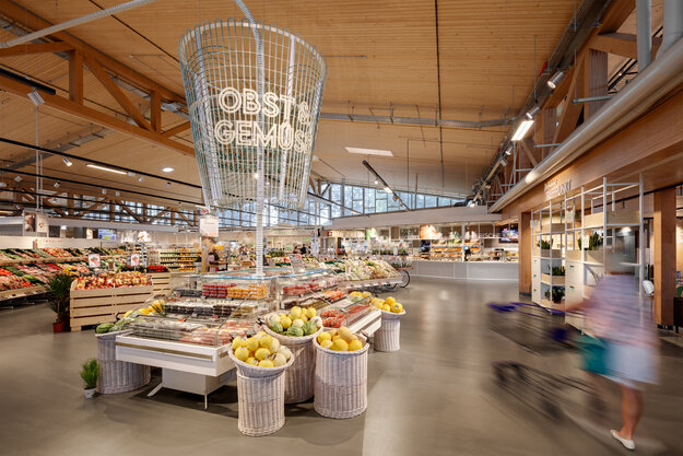 Das Nachhaltigkeitskonzept basiert auf einer Zusammenarbeit zwischen WWF und EDEKA und wird durch den Einsatz von „Tags“ im Markt umgesetzt. Diese informieren die Kunden über die Auswirkungen von Nachhaltigkeitszielen auf das Store Design. Nachhaltigkeit war von Anfang an zentral und zieht sich durch das gesamte Projekt. Das Ergebnis ist eine flexible Marktfläche, die Anpassungen an Saisonalität und Sortiment sowie langfristige Änderungen im Layout ermöglicht. Der Fokus des Konzepts liegt auf Nachhaltigkeit durch Reduktion.