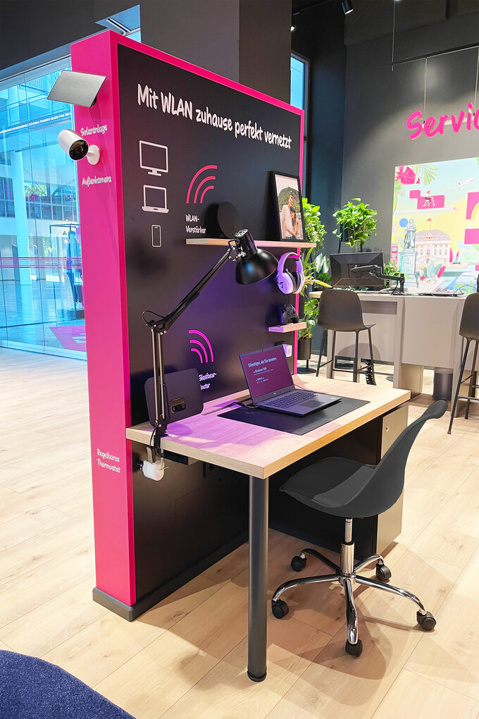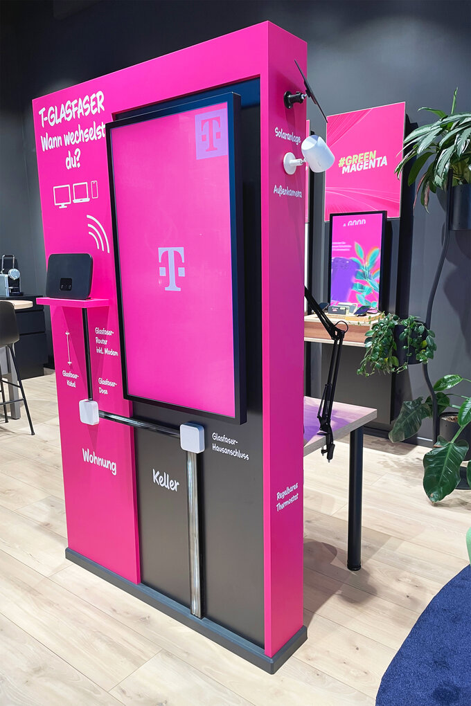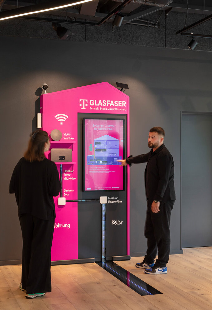Mit der Konzeption eines innovativen Moduls setzt die Telekom neue Maßstäbe in der Customer Education. Das Beratungstool veranschaulicht interaktiv relevante Bestandteile für optimalen Glasfaseranschluss und eine leistungsstarke Heimvernetzung. Ein integrierter Screen mit digitalem Content bietet Empfehlungen zu Hardware, Netz und Tarifen. Ergänzend sorgt eine Boden-Intarsie für die Visualisierung des Glasfasernetzes. Die plastische Darstellung macht Technik greifbar und reduziert Berührungsängste. Mit dem neuen Modul wird Beratung erlebbar: Kunden erhalten einen ganzheitlichen Überblick über ein perfekt vernetztes Zuhause.
