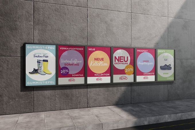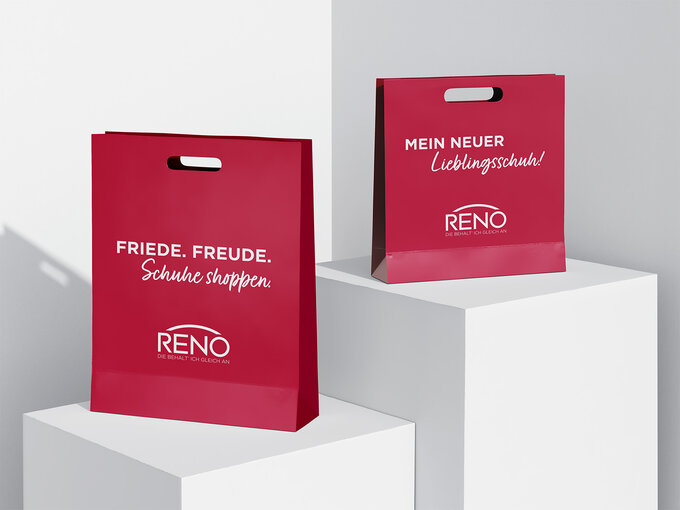 Rebranding der Marke RENO. Das RENO-Markensignet bestehend aus Logo und Claim „Die behalt’ ich gleich an“ wurde einem Refresh unterzogen, der es zeitgemäßer und moderner macht. Im Zuge einer „Wiederbelebung“ der bekannten Marke wurde zudem ein neues Corporate-Design-Manual entwickelt. Bewährte Elemente blieben darin erhalten, während überholte Stilmittel, Schriften und Vorgaben ersetzt wurden durch eine neue Typografie und eine klarere Formsprache. So ließen sich Kampagnen, Werbemittel sowie Kommunikationsmaßnahmen am Point-of-Sale entwickeln, die das RENO Image unterstreichen, weil sie nahbar, freundlich und lebendig wirken.