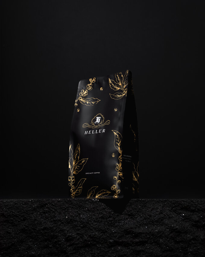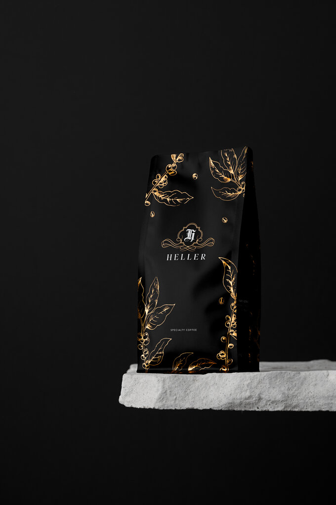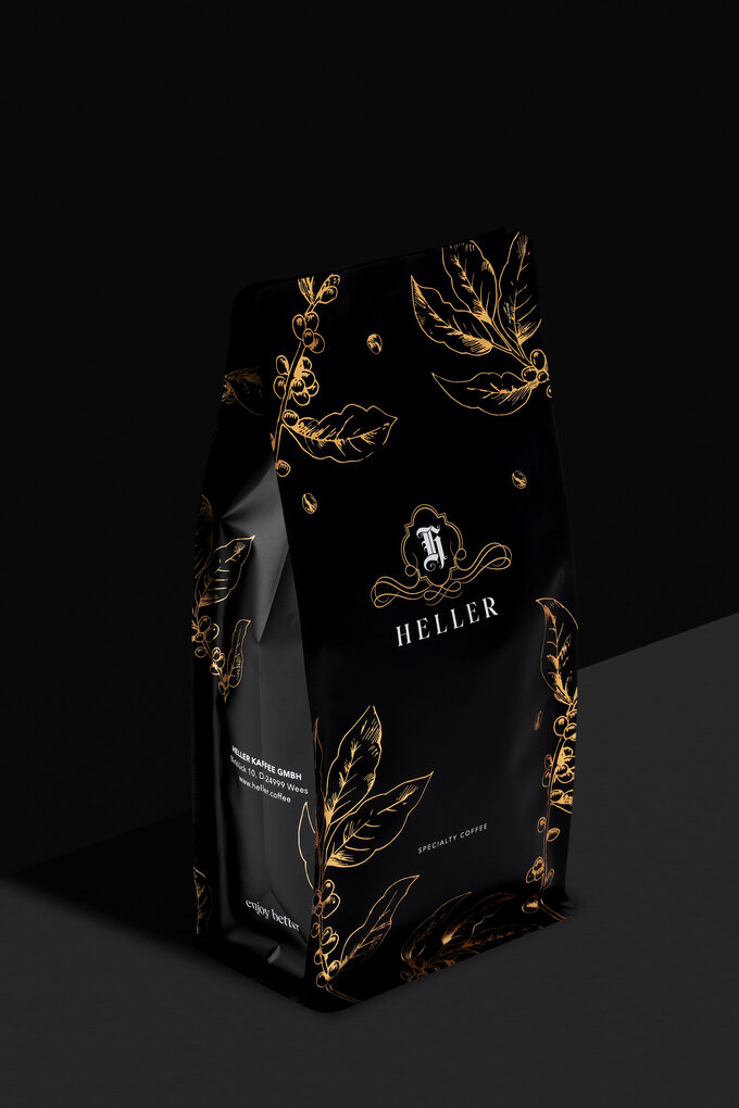 Heller Kaffee verbindet nachhaltiges Denken mit einem ästhetisch anspruchsvollen Designansatz. Die Verpackung aus Monomaterial schafft durch die Kombination von schwarzen Linien und goldenen Akzenten eine elegante und zugleich funktionale Aussage. Dieser Ansatz spiegelt die Markenwerte Transparenz und Qualität wider, während er die ökologische Verantwortung betont. Mit einer klaren visuellen und strategischen Ausrichtung gelingt es dem Projekt, Konsument*innen auf emotionaler und rationaler Ebene gleichermaßen anzusprechen.