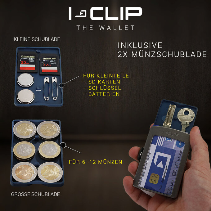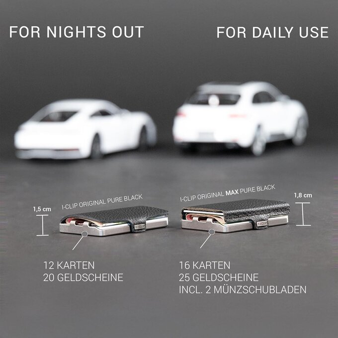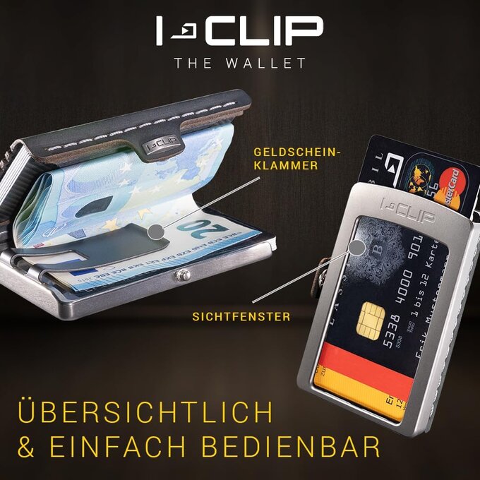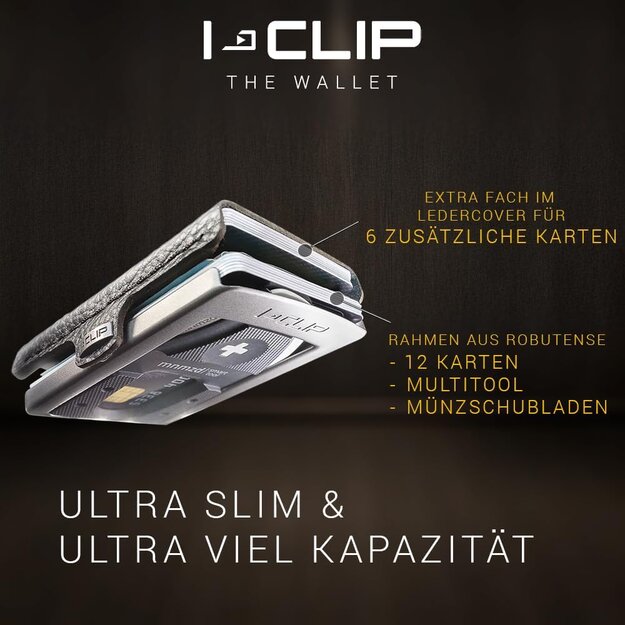 Der neue I-CLIP MAX repräsentiert die perfekte Symbiose zweier Welten. Durch die Steigerung der Kartenkapazität von 12 auf 18 Karten, das großzügige Platzangebot für Scheine, einem RFID-Blocker und dem innovativen MNMZD-Tool setzt er neue Standards. Doch selbst mit dieser Funktionsvielfalt bleibt er seinem unschlagbaren Design treu - dünn, flexibel und ästhetisch ansprechend. Diese Eigenschaften werden durch herausragende Vielseitigkeit und meisterliche Handwerkskunst ergänzt, wodurch der I-CLIP MAX nicht nur ein Accessoire, sondern ein Statement für Stil und Funktionalität darstellt.