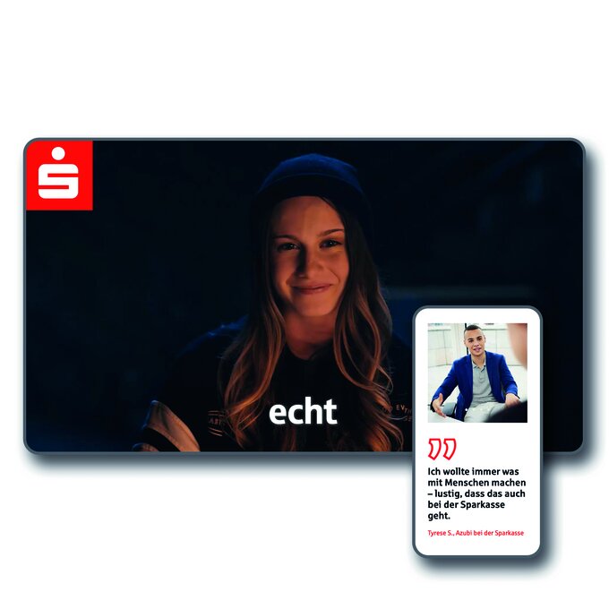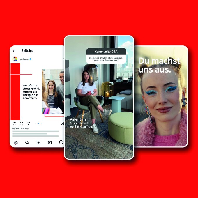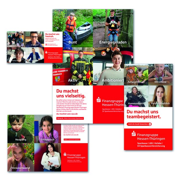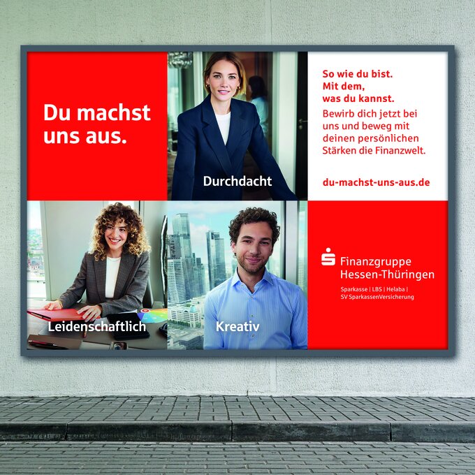 Die Recruiting-Kommunikation für die Sparkassen-Finanzgruppe Hessen-Thüringen stellt in Aussicht, was man als junger Mensch auf dem Arbeitsmarkt nur selten bekommt: echte Wertschätzung. Dazu sprechen wir eine persönliche Einladung aus: „Du machst uns aus. So wie du bist. Mit dem, was du kannst.“ Die integrierte Kampagne, in der echte Auszubildende der Sparkassen und ihrer Verbundpartner LBS, Helaba und SV SparkassenVersicherung zum Einsatz kommen, adressiert die Zielgruppen Azubis und Young Professionals auf allen relevanten Kanälen und fokussiert sich dabei auf die individuellen Stärken der Menschen.