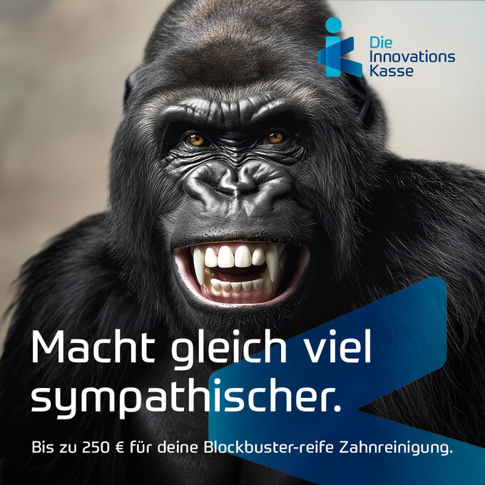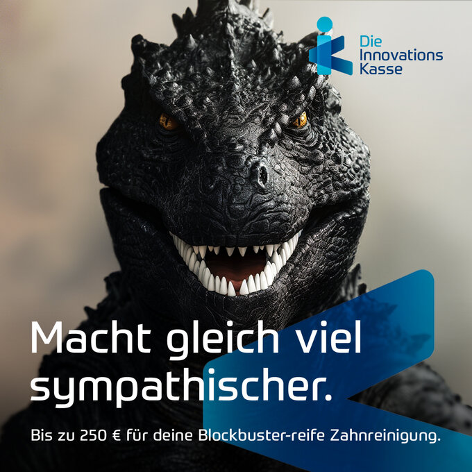 Mundhygiene wird in der Gesellschaft als eher nüchternes Thema wahrgenommen. Wie kann hier der außergewöhnlich hohe Zuschuss der IK zur professionellen Zahnreinigung einprägsam beworben werden? Wir nutzen den Hype um den Blockbuster "Godzilla x Kong: The New Empire" und machen daran angelehnte Kreaturen zu strahlenden Hauptwerbeträgern. Monstermäßige Porträts zeigen humorvoll gepflegte Zähne, die den Protagonisten einen ersichtlichen Image-Boost verleihen. Mit der Zeile "Macht gleich viel sympathischer. Bis zu 250 € für deine Blockbuster-reife Zahnreinigung." erzielt die IK digital maximale Awareness für Angebot und Marke.
